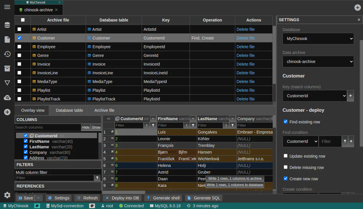 CRUD operations - configure Create, Find, Update and Delete operations on each table