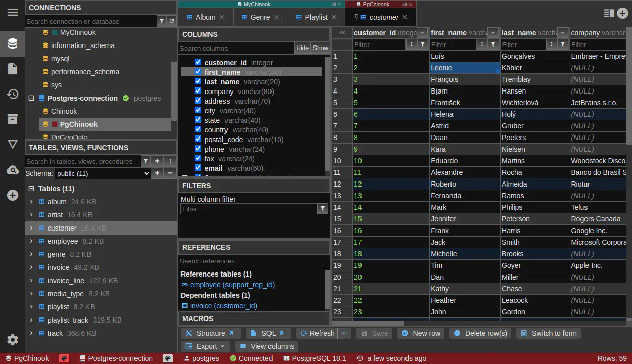 pgAdmin の PostgreSQL サポートは気に入っているものの、インターフェースが煩雑で、複数種類のデータベースも扱いたい場合は、DbGate をお試しください。PostgreSQL に加えて MySQL、SQL Server、MongoDB なども美しく扱えるクロスプラットフォームのデータベースマネージャーで、よりクリーンで直感的なインターフェースを備えています。