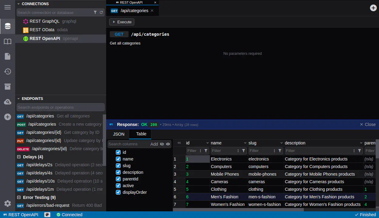 DbGate は従来のデータベースを超えて API エンドポイントもサポートし、REST API、GraphQL サービス、oData エンドポイントと、同じ使い慣れたインターフェースでやり取りできるようにします。このプレミアム機能により、DbGate はデータベースと API の両方に対応するユニバーサルなデータクライアントになります。