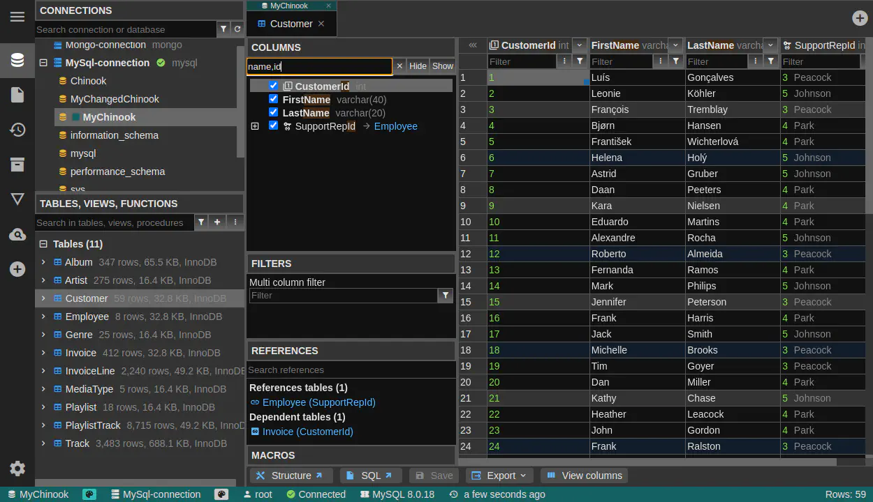 「,」を使って複数の列を検索できます。DbGate はデータブラウザーでフィルタされた列のみを表示するようになりました。多くの列を持つテーブルを扱う際に大きな助けになります。