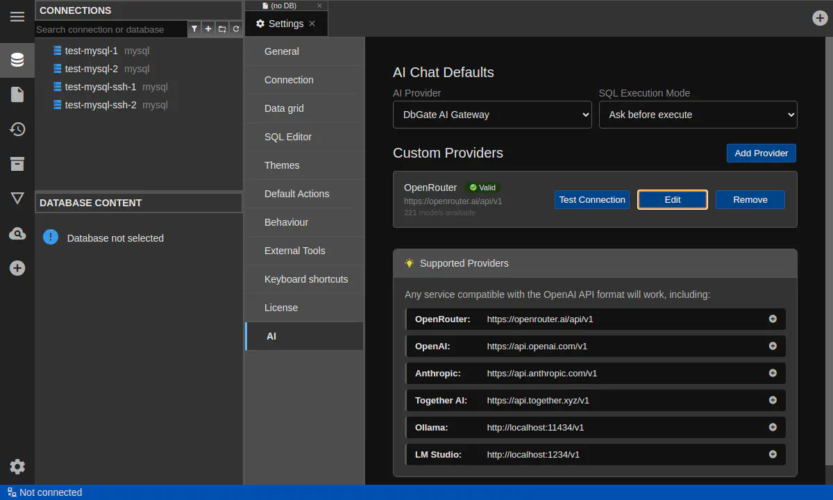 最近のバージョンで、AI データベースチャットに重要な改善を加えました。より多くの LLM モデルをサポートしたほか、自分の API キーを使用して LLM プロバイダーに直接接続し、DbGate AI ゲートウェイをバイパスできるようになりました。これにより、データを当社サーバーに送信したくない場合にも対応できます。