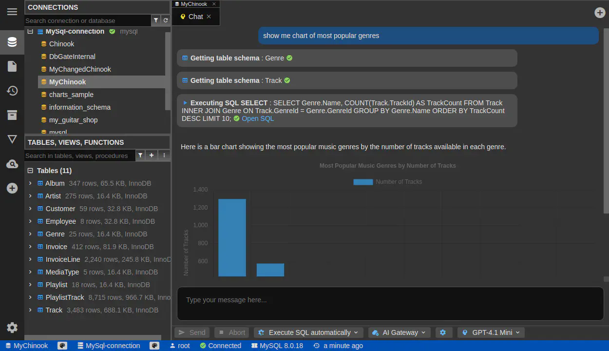 DbGate はチャットウィンドウ内にチャートを表示します。これは、例えば ChatGPT で行うのと同様の動作です。