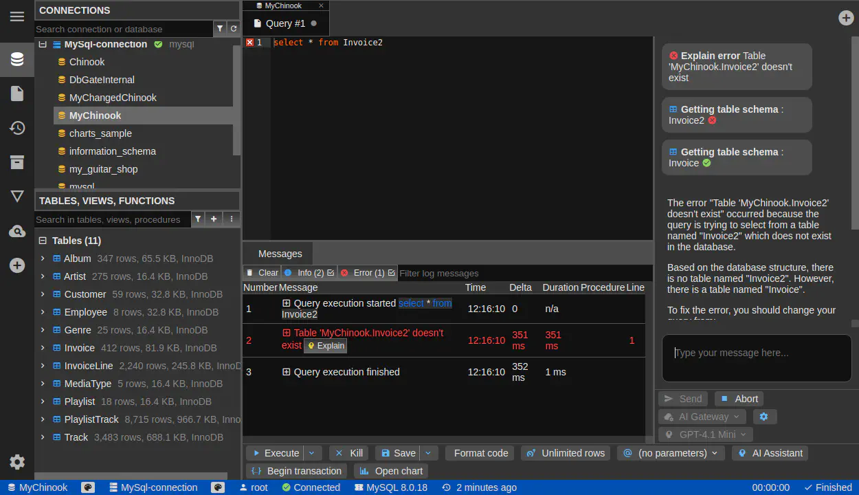 このバージョンでは、AI データベースチャットにいくつかの改善が加えられました。まず、AI に SQL エラーメッセージの説明を依頼できるようになり、SQL コードのどこが問題なのかを特定しようとします。次に、結果をチャートとして表示するよう AI に依頼できるようになりました。棒グラフ、円グラフ、折れ線グラフなど、さまざまなチャートに対応しています。
