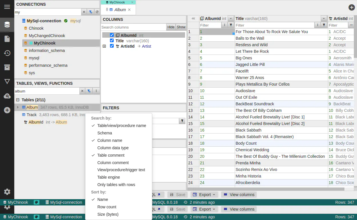 接続およびデータベース内の検索