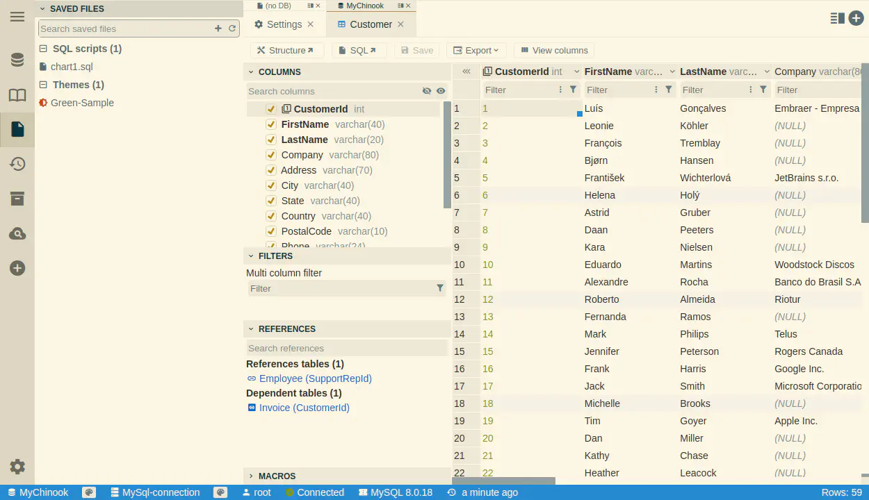 다양한 필터링 옵션과 연관된 테이블 탐색 기능을 제공합니다. 마스터-디테일 뷰와 외래 키 조회를 사용하여 데이터베이스 관계 간을 쉽게 탐색할 수 있습니다. 배치 업데이트와 매크로로 데이터를 편집하세요.