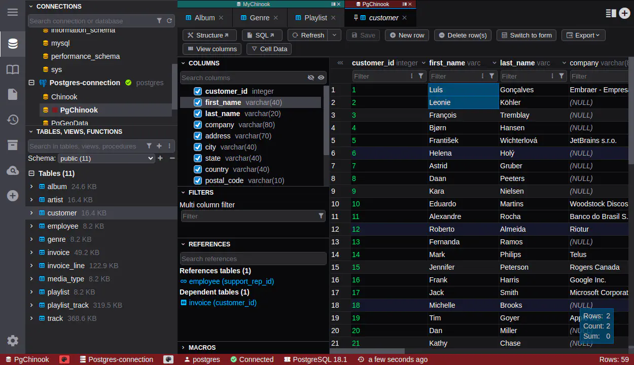 - 멀티 데이터베이스 지원: MySQL뿐 아니라 PostgreSQL, SQL Server, MongoDB 등 다양한 데이터베이스를 다룰 수 있습니다.