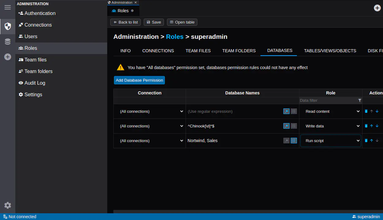 역할 기반 권한을 한 번 정의하고, 데이터베이스, 스키마 및 객체 전반에 일관되게 적용하여 완전한 제어를 유지하세요.