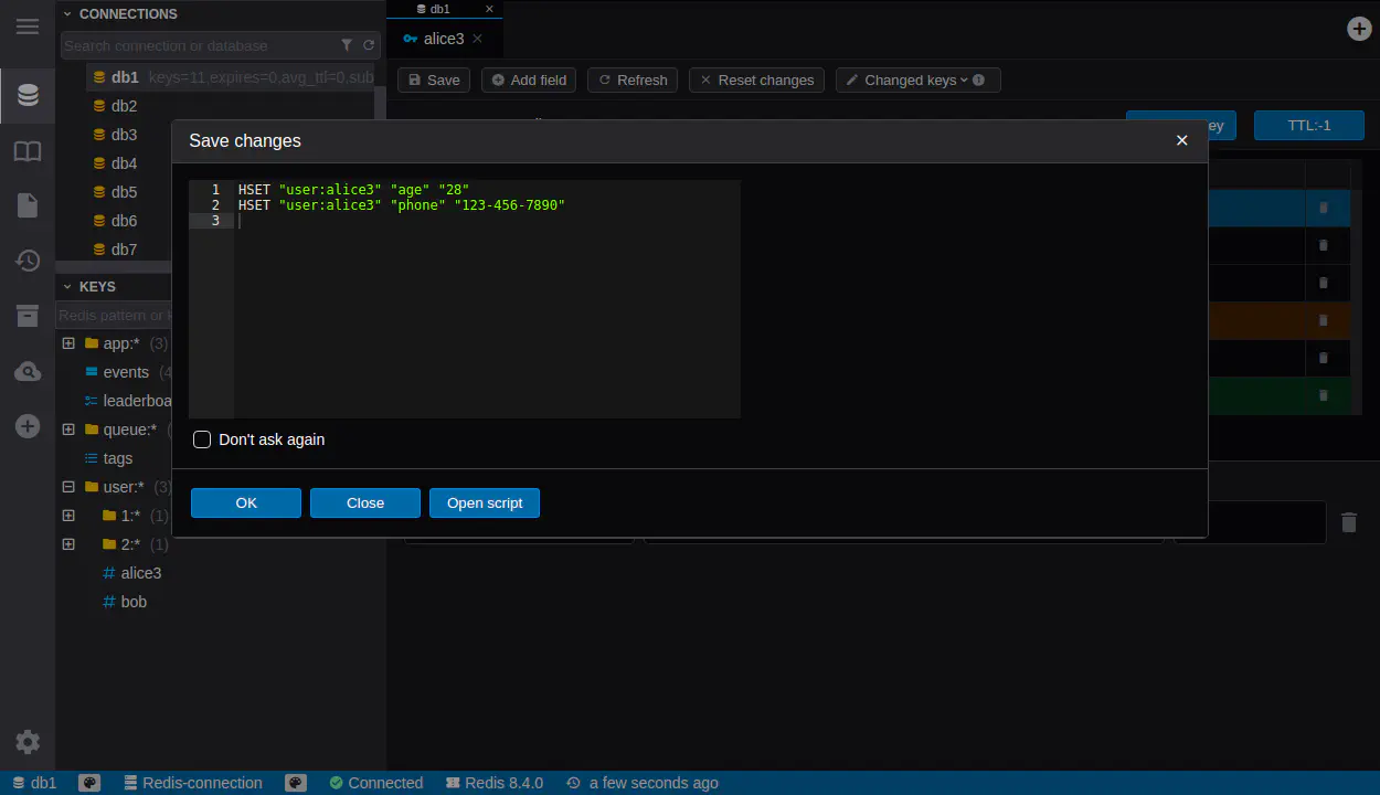 여러 키 편집 - 데이터베이스 수정은 다른 DbGate 지원 데이터베이스와 동일한 방식으로 수행됩니다. 변경된 모든 키는 “Save” 버튼을 클릭한 후 하나의 트랜잭션으로 저장됩니다. 저장 전에 생성된 명령의 미리 보기도 확인할 수 있습니다.