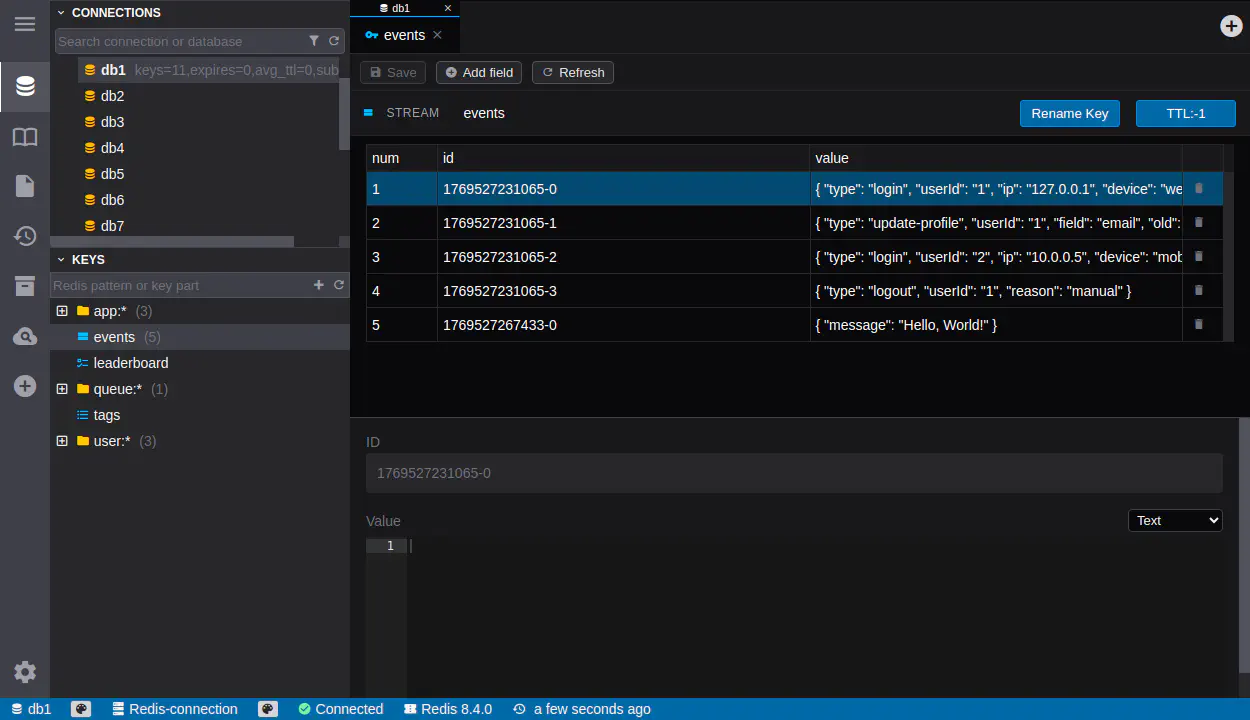 Redis 스트림 지원 - 새 스트림 항목 생성 및 기존 스트림 항목 삭제를 포함해 Redis 스트림을 완전히 관리합니다.