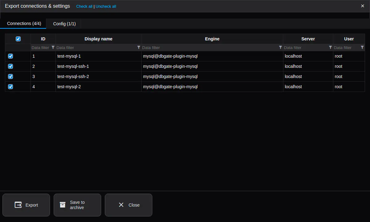 DbGate에서는 여러 파일을 한 번에 내보낼 수 있습니다. 새 버전에서는 내보낸 파일로 ZIP 파일을 생성하는 기능이 추가되었습니다. ZIP 파일에서 가져오는 것도 가능합니다. 또한 ZIP 파일을 데이터 아카이브로 저장할 수 있으며, 데이터 아카이브 탐색기에서 이를 탐색할 수 있습니다.