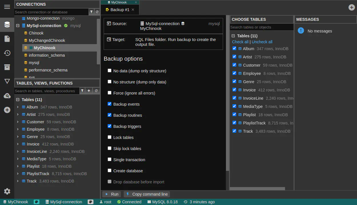 DbGate now offers GUI interface for native backup tools, currently we are supporting MySQL and PostgreSQL. This solution robust and performant, as it uses standard tools shipped with database.