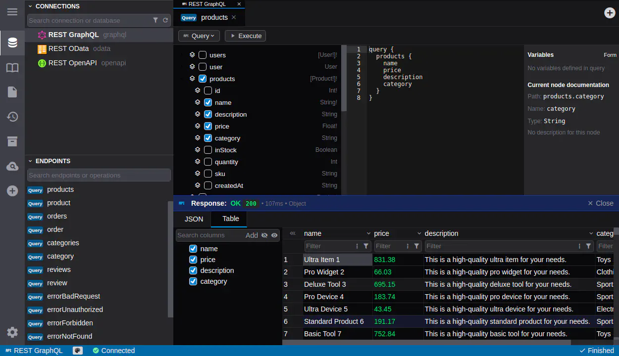 GraphQL support in DbGate allows you to connect to GraphQL endpoints and interact with them as if they were databases. You can explore the schema, execute queries and mutations, and even use features like filtering and “Load all” for Relay Connections.