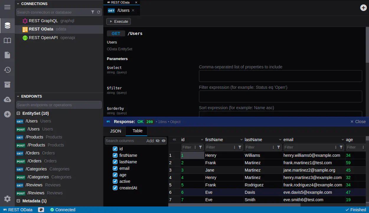 oData is a standardized protocol for building and consuming RESTful APIs, mainly used in Microsoft ecosystems. oData is very close to a traditional database in terms of data structure and query capabilities, so it fits well with DbGate’s approach to working with data.