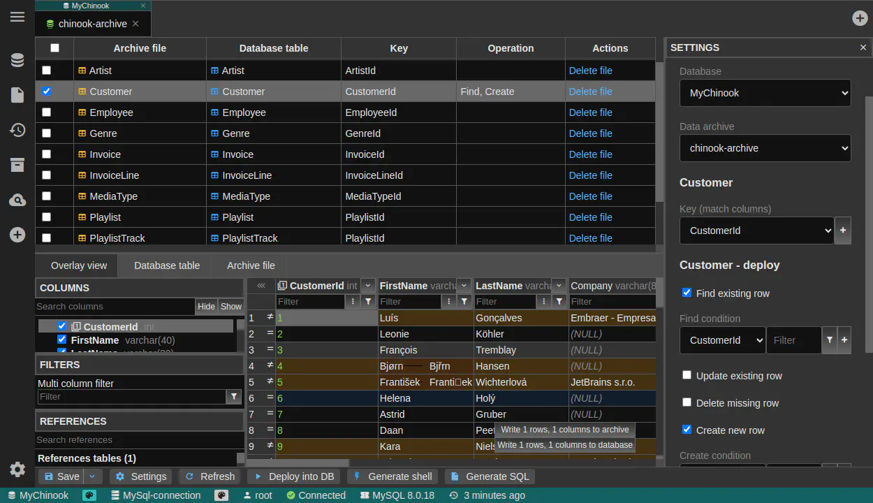 Ukladajte svoje dáta lokálne v súboroch NDJSON. Vizuálne porovnávajte a synchronizujte dáta medzi vašimi súbormi a skutočnou databázou. Replikujte svoje dáta z archívu do databázy, pričom zachováte vzťahy.