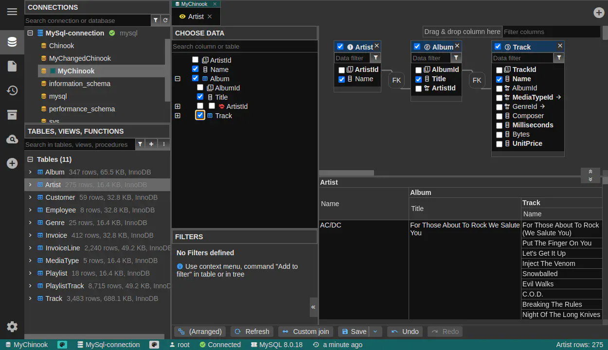 Návrhár dotazov, schopný vytvárať joiny medzi SQL tabuľkami, kolekciami MongoDB a kontajnermi CosmosDB. Zobrazuje ER diagramy a grafy, zobrazuje GEO dáta na mape. Exportuje grafy, mapy a diagramy ako HTML stránku.