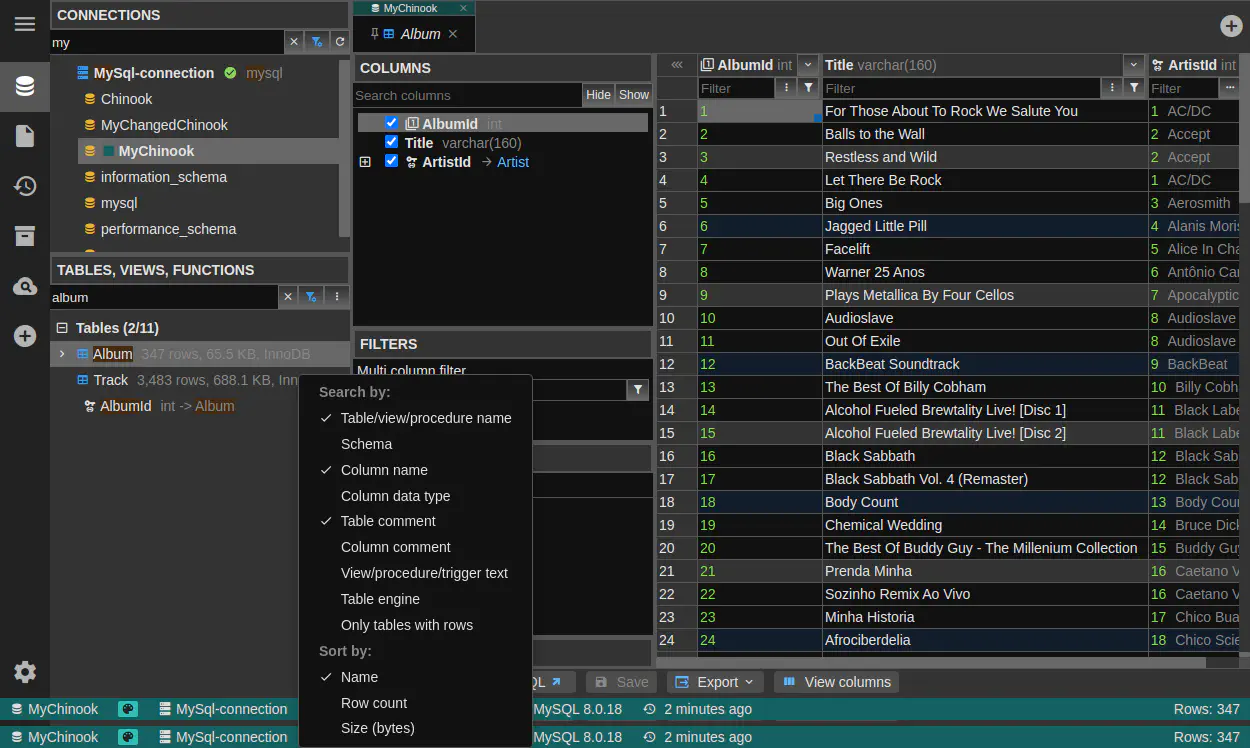 Mnoho možností filtrovania, prehliadanie súvisiacich tabuliek. Používajte zobrazenia master-detail a vyhľadávanie cudzích kľúčov pre jednoduchú navigáciu medzi vzťahmi vo vašej databáze. Upravujte dáta pomocou hromadných aktualizácií a makier.