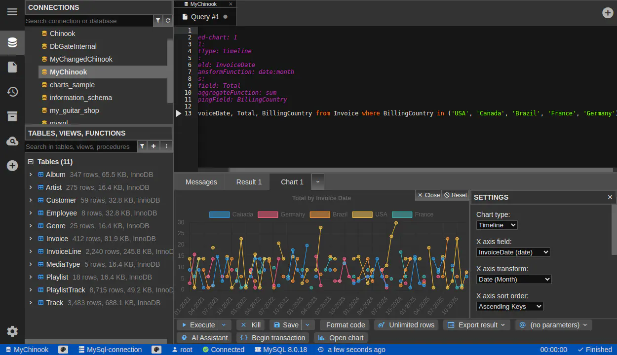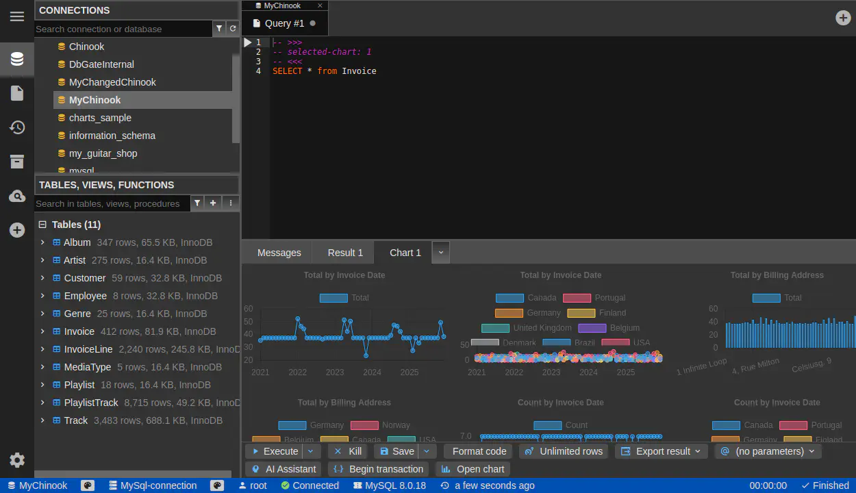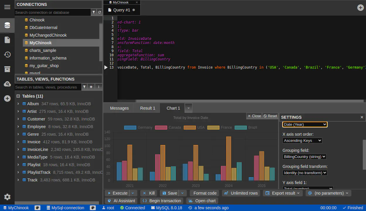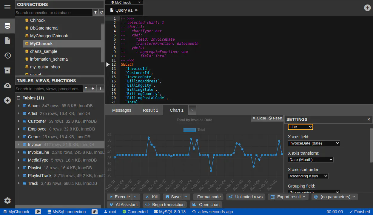 Ukázal som základné použitie funkcie grafov v DbGate. Môžete nám nechať komentáre k tejto téme na X tweet. Viac informácií o grafoch nájdete v dokumentácii.