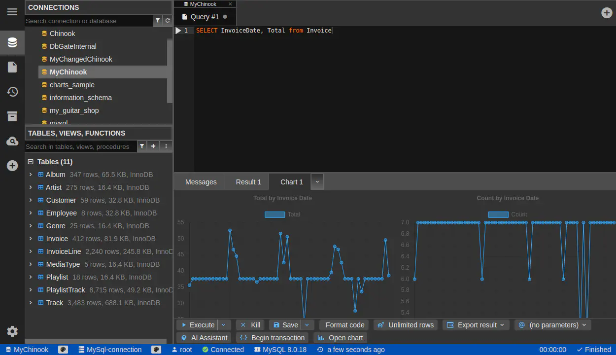 Tento návod ukazuje, ako používať DbGate na vytváranie pekných a informačne bohatých grafov. Predpokladám, že ste už pripojení k databáze pomocou DbGate a ste schopní spustiť SQL dotaz alebo použiť návrhára dotazov na získanie údajov z SQL tabuliek.