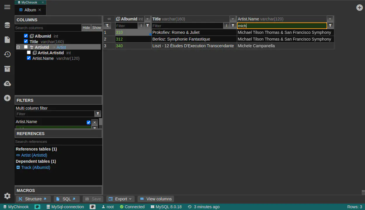 DbGate supports master-detail views, letting you see related records from different tables side by side. You’ll find available views in the “References” section – they’re automatically detected from the foreign keys in your database schema.