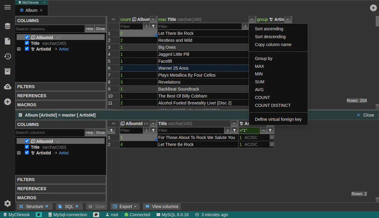 SQL databases have powerful grouping and aggregation features through the GROUP BY clause. DbGate makes this super easy – you can group your data by one or more columns right from the data browser. Just click on any column header and select “Group by”. That’s it!